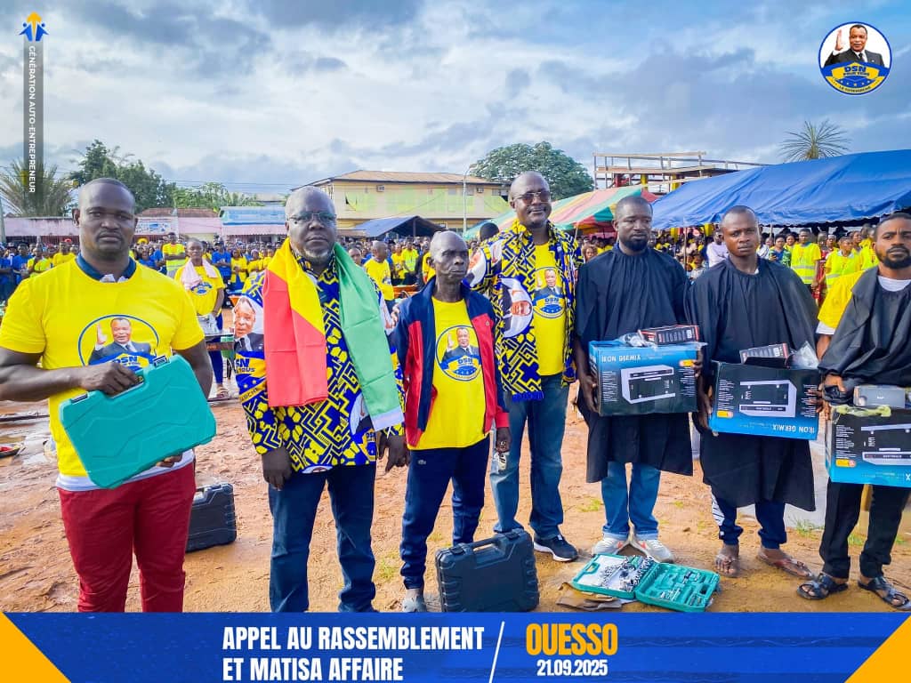 Politique 22-09-2025 19:45 Le coordonnateur général de Génération auto-entrepreneur (GAE), Digne Elvis Tsalissan Okombi, a organisé le 21 septembre une marche populaire à Ouesso avant d’apporter un soutien financier et en kits entrepreneuriaux aux jeunes désoeuvrés et aux femmes battantes du chef-lieu de la Sangha, à travers les projets « Matisa affaires » et « Loboko ya patriarche ».
