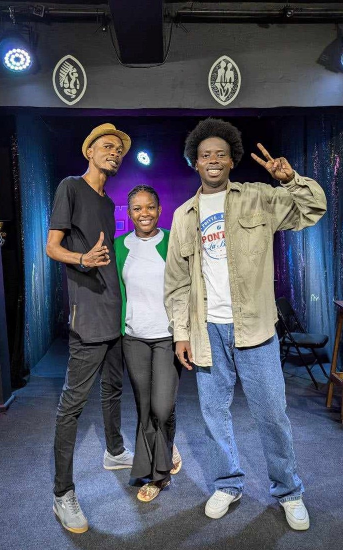 1- Juste Parfait posant avec Daly Cardinal et M’vata/ DR 2- L’artiste comédien en spectacle à Yaoundé, au Cameroun / DR