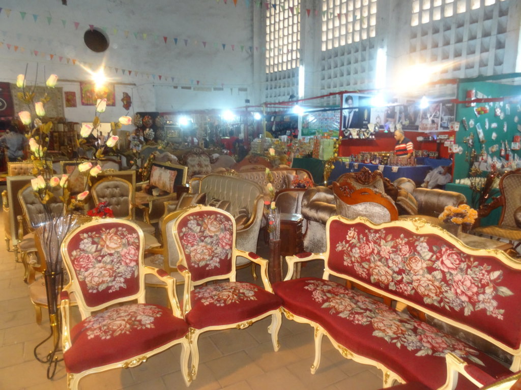 - Un responsable de stand des tapis donnant des détails à un visiteur - Une vue de quelques meubles exposés