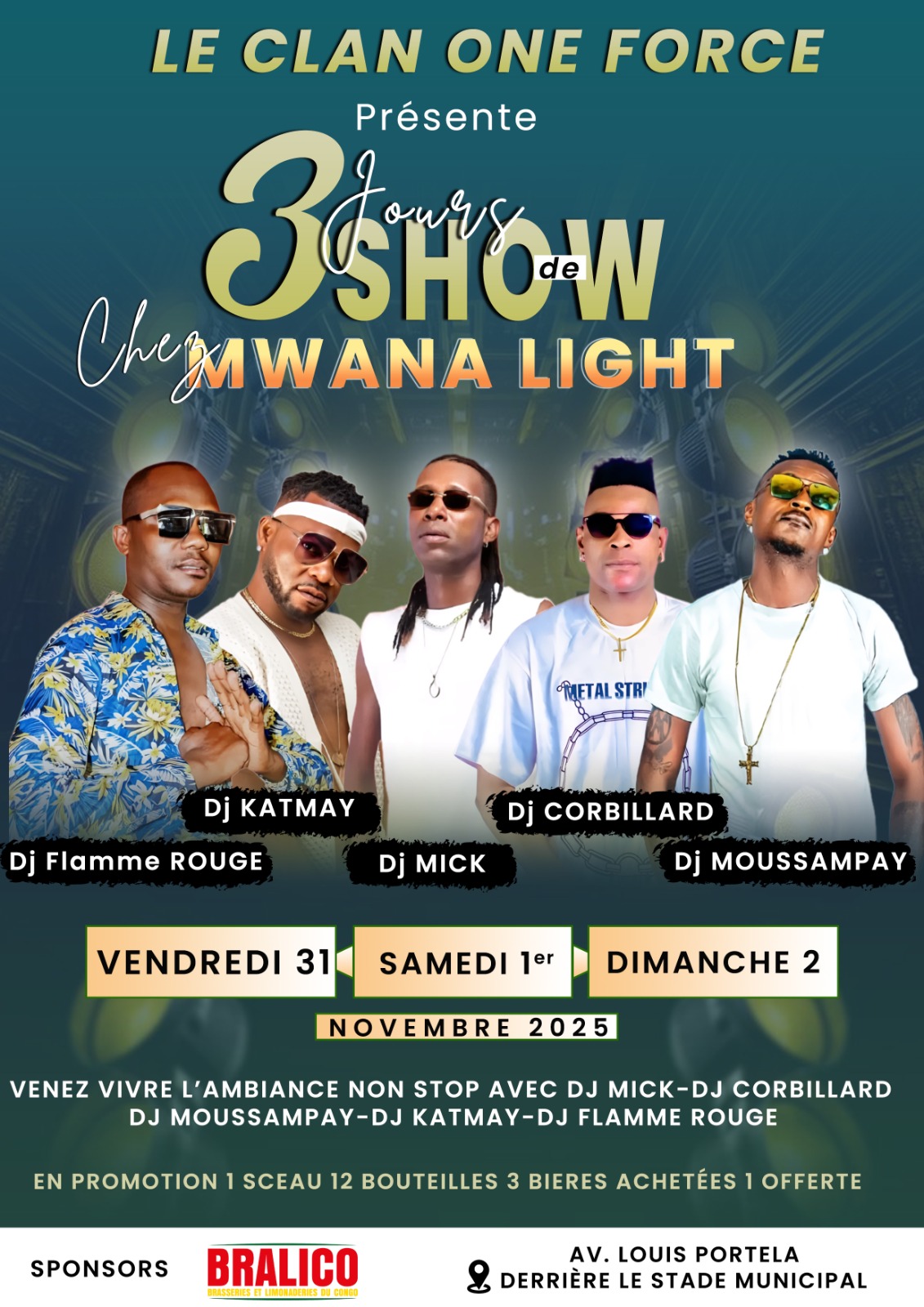 DJ Katmay, pionnier des soirées underground à Brazzaville, ouvrira le bal avec ses transitions audacieuses et son sens du rythme chirurgical. Véritable catalyseur d’ambiance, il transforme chaque set en expérience collective, où les corps s’accordent à la pulsation. À ses côtés, DJ Flamme Rouge, artisan du groove, mêle les racines de la rumba congolaise aux textures électro les plus contemporaines. Ses performances, souvent décrites comme des voyages sensoriels, séduisent autant les puristes que les explorateurs sonores. DJ Mick, ambassadeur des vibes afrobeat, construira ses sets comme des fresques musicales. Son élégance rythmique et sa capacité à créer des atmosphères enveloppantes font de lui une figure respectée des scènes festives du pays. Plus radical, DJ Corbillard revendique une approche provocatrice du mixage. Chaque piste devient chez lui un manifeste rythmique, une déclaration sonore qui bouscule les codes et réveille les consciences. Son audace, alliée à une maîtrise technique affûtée, promet des moments de tension jubilatoire. Enfin, DJ Moussampay incarne la relève du Clan One Force. Jeune mais déjà redoutable, il s’est imposé par ses montées en puissance spectaculaires et son sens du crescendo. Sa présence apporte une touche de fraîcheur et d’innovation à cette programmation explosive. Les organisateurs espèrent attirer un public éclectique : amateurs de musique, curieux culturels, fidèles du Clan One Force et noctambules en quête d’émotions. Au-delà du divertissement, l’événement vise à renforcer les liens communautaires, valoriser les talents locaux et inscrire Pointe-Noire comme une capitale festive incontournable. En misant sur la diversité des styles, la puissance des platines et l’énergie collective, “3 jours de show chez Mwana light” s’annonce comme une immersion dans l’âme vibrante du Congo urbain. Là où la musique devient langage, et la fête un acte de reconnaissance culturelle.
