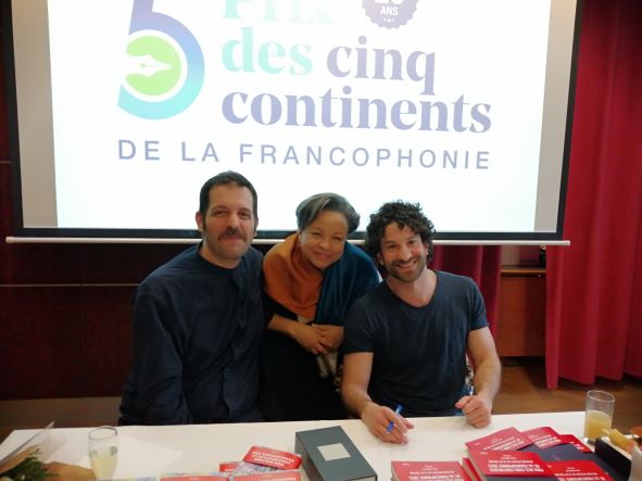 Marie Alfred Ngoma Légendes et crédits photo : Myriam Senghor-Ba, Spécialiste de programme à l’OIF, en charge du Prix des cinq continents, encadrée par l'écrivain Karim Kattan, lauréat et Miguel Bonnefoy, mention spéciale / Crédit photo Marie Alfred Ngoma