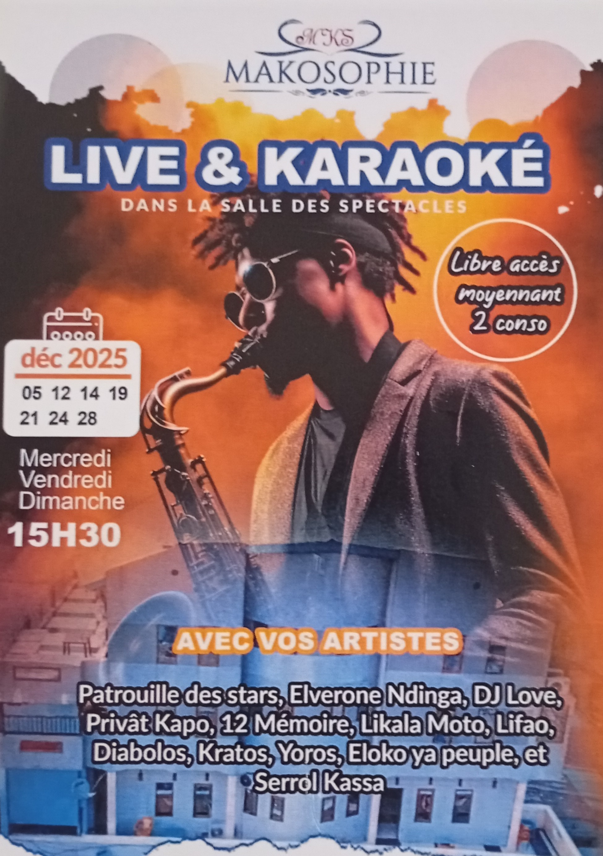 Promouvoir la musique congolaise : l’établissement "Makosophie" organise une série de concertsJeudi 4 Décembre 2025 - 17:04 En vue de renforcer la conservation culturelle des valeurs artistiques congolaises et de permettre aux amoureux de la bonne musique de passer les fêtes de fin d’année en beauté, la maison MKS que préside Bienvenu Okoma, plus connue sous le pseudonyme de Makosophie, organise un live et karaoké dans sa salle des spectacles, les 5, 12, 14, 19, 21, 24 et 28 décembre. L’entrée est gratuite.