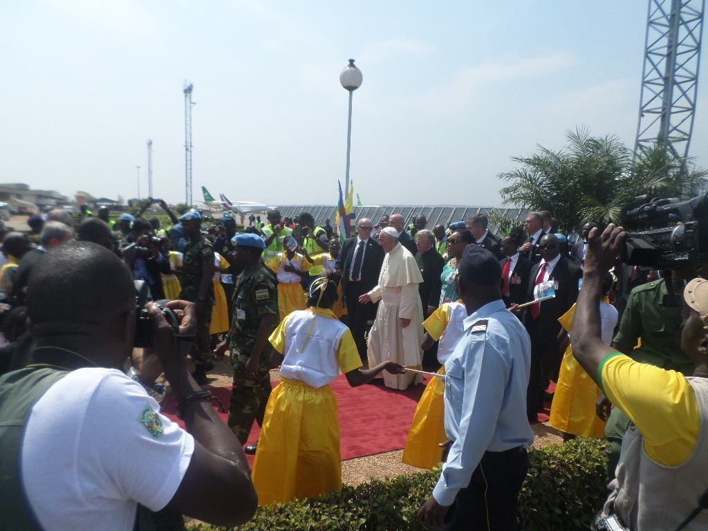 Sur le tarmac de l’aéroport de Bangui, le pape François a été reçu par la présidente de la transition, le Premier ministre, le président du Parlement transitoire et les autres responsables de la transition. Les trois leaders confessionnels du pays, l’archevêque de Bangui, Mgr Dieudonné Nzapalainga, debout côte-à-côte l’imam Oumar Kobine Layama, président de la Communauté islamique de Centrafrique et le président de l’Alliance des évangéliques en Centrafrique ont reçu la bénédiction du pape. Évitant un risque sécuritaire ou un débordement d’une foule enthousiasmée, le convoi du pape a été plus rapide que d’habitude.
