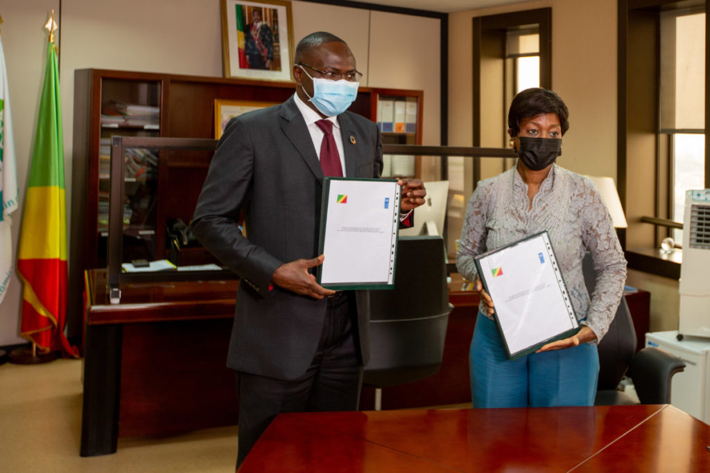 Photo 2 : la ministre Arlette Soudan-Nonault et le représentant résidant du PNUD au Congo, Maleye Diop, brandissant les documents paraphés (crédit photo/ DR)