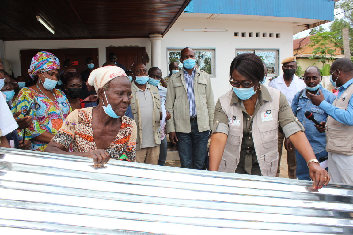 Rominique Makaya Légendes et crédits photo :Photo 1 : La ministre remettant des kits de construction à une sinistrée