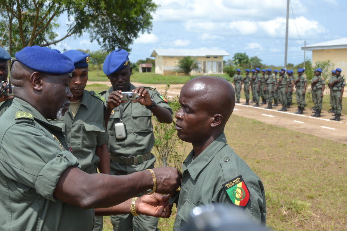 Au cours de cette session, les participants ont peaufiné leurs connaissances sur plusieurs aspects relatifs aux fondamentaux du métier de fusilier notamment entrainés aux techniques de protection et défense des bases aériennes, ce, de jour comme de nuit, sous la pluie, dans la boue, dans les forêts de Makoua, dans la grande forêt du Mayombe et sur les montagnes de Boulankio. S’adressant aux stagiaires, le général de brigade aérienne Jean Baptiste Philippe Tchikaya, chef d’état-major de l’armée de l’air, a déclaré : « Le commandement vous a choisis et formés pour mettre en pratique, les connaissances que vous venez d’acquérir afin que vous puissiez à votre tour, instruire et encadrer vos subordonnés, et que soient renforcées les capacités opérationnelles de vos unités et formations ». Le deuxième temps fort était la remise des diplômes et le port d’insignes de brevet supérieur fusco-air par les autorités militaires et les autorités administratives de la sous-préfecture de Makoua. La cérémonie s’est achevée par un défilé militaire, le tout couronné à la fin par un apéritif. Guillaume Ondzé Légendes et crédits photo :Cérémonie de port d'insigne |
